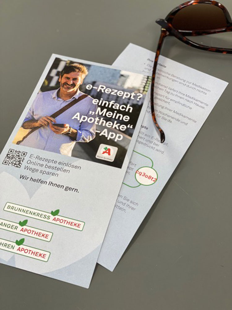 Für eine schnelle Vorbestellung Ihrer Medikamente und Übermittlung Ihrer Rezepte und e-Rezepte, laden Sie unsere App Meine Apotheke herunter. Dazu einfach den QR-Code für unsere Apotheke scannen, ein Foto vom Rezept machen und schon ist Ihre Bestellung bei uns. In der nahen Zukunft wird es auch die Möglichkeit geben, Ihre e-Rezepte von Ihrer Versichertenkarte an uns zu übertragen. Ganz einfach.